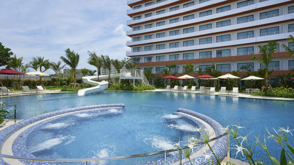 北谷町・読谷村の中でも随一の景勝地・残波岬の側に建つホテル「グランドメルキュール沖縄残波岬リゾート」。北谷町・読谷村のホテルでも珍しいオールインクルーシブで滞在できるので、もちろん朝食も追加料金なしで楽しめますよ。ビュッフェレストラン「Le SENSORIEL」の朝食では約120種類と連泊していても食べきれないほどのメニューが並びます。中でもおすすめなのが、一工夫加えられた沖縄料理の数々。ミルク仕立ての沖縄そばやトリュフオイルを垂らしたりアレンジできるゴーヤチャンプルーなどここでしか食べられない朝食が用意されていますよ。ホテルから歩いて約5分の「残波ビーチ」で夏季限定で営業している「ざんぱウォーターアスレチック」は、北谷町・読谷村のホテルの中でも子どもたちに人気のアクティビティです。