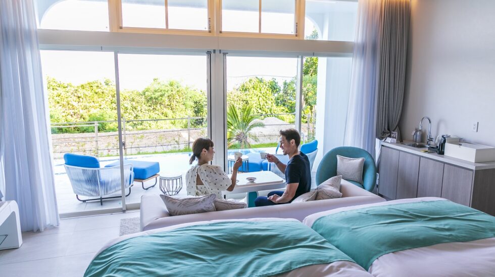 「ブルーオーシャン ホテル&リゾート宮古島」は、ギリシャのサントリーニ島のような雰囲気が人気のホテル。白を基調に、ブルーをセンス良く使ったインテリアは特に女性に好評なので、カップル旅行にぴったり。客室はヴィラ棟とホテル棟に分かれ、すべてゆったりとリゾートを満喫できるスイートルーム仕様。よりプライベートを満喫したいカップルには、プライベートプールを備えたヴィラ棟がおすすめ。プールにはプライバシーを重視した仕切りもあり、カップルで人目を気にせずにくつろげますよ。さらに、ルーフトップテラスには絶景のジャグジーも完備。宮古ブルーの海を眺めながら、ジャグジーで疲れを癒やしたりスパークリングワインを楽しんだり、カップルで贅沢な時間が過ごせそう。