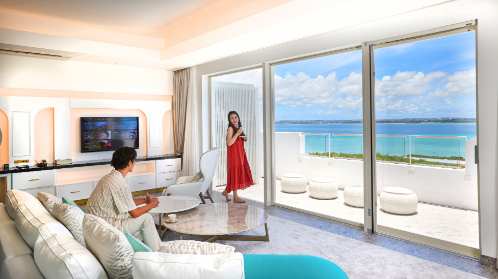 2024年3月、宮古島から橋で渡れる伊良部島に誕生した「サントリーニ ホテル & ヴィラズ 宮古島」。サントリーニ島を模した階段状の造形と、白と青の色彩が美しいホテルです。まるで海外旅行に来たかのような気分が味わえるので、新婚旅行にもおすすめ。館内2階のテラスにある「ベルタワー」はホテルのシンボル。宮古島から繋がる伊良部大橋を一望でき、大切な人と一緒に鐘を鳴らしたり、思い出の写真を撮ったりと、新婚旅行らしい時間を過ごせるスポットです。新婚旅行なら思いっきり贅沢に、ホテルで最も広くラグジュアリーな「ロイヤルスイート ジャグジー付き」がおすすめ。ホテル最上階に位置するため眺望の良さも格別で、宮古ブルーの海と伊良部大橋の全景を独り占めできますよ。