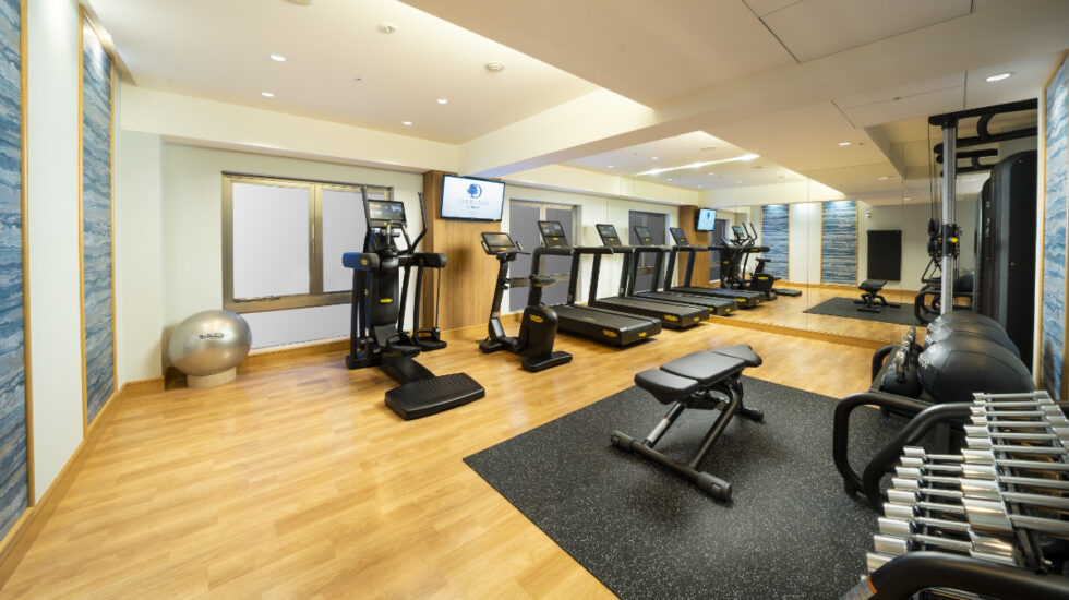那覇空港から車で約10分の「沖縄ハーバービューホテル」。那覇バスターミナルやゆいレール壷川駅も徒歩圏内で、観光の拠点に最適なホテルです。那覇にいながらにして、リゾート感あふれるガーデンプールを利用できるのも人気のポイント。夏季限定ですが、大人用・子ども用の両方があるのもうれしいですね。ホテル1階のロビーフロアのフィットネスジムは、宿泊者なら誰でも無料で使えます。ジムには、トレッドミルをはじめリカンベント・バイク、 ダンベルセット、バランスボールなど、エクササイズ機器が多彩。ヨガ用のストラップ・ブロックやマットも用意されています。ジムを訪れる際は、ウェアや靴下の準備を忘れないようにしてくださいね。