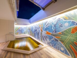 ちょっぴり変わった大浴場があるのが「ロワジールホテル 那覇」。半露天風呂の壁には、沖縄の染物「紅型」をタイルで表現した巨大壁画アート! ダイナミックなアートを鑑賞しながら温泉につかれば、リラックスできますよ。姉妹館「ロワジール スパタワー 那覇」と同じ、三重城温泉の源泉かけ流しを堪能して。塩分を含む温泉による、保温効果や引き締め効果を楽しんでくださいね。タオルのレンタルは有料なので、客室から持参するのを忘れずに。アメニティも併せて持っていくようにしましょう。また、温泉を利用した珍しいプールがあるのもうれしいポイント。温泉7割・真水3割の室内プールで、しかも水温は33度だから、一年中快適に遊べますよ。