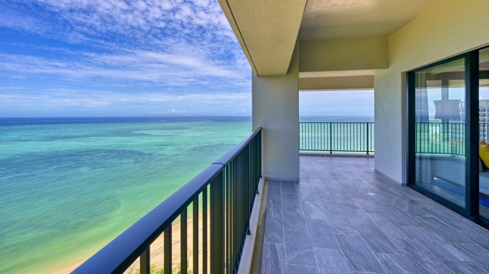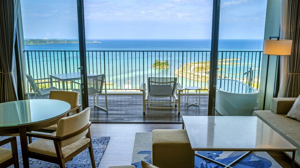 那覇市街から車で約20分とアクセス良好な場所に建つ「沖縄プリンスホテル オーシャンビューぎのわん」。全室にテラスを備え、どの部屋からも宜野湾の海を一望できる贅沢なオーシャンビューが広がります。