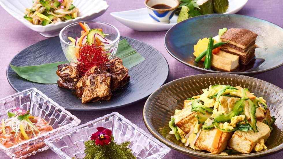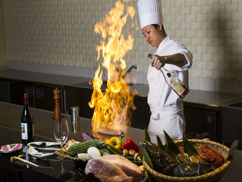 「琉球ホテル&リゾート 名城ビーチ」では、時間帯に応じて9カ所のレストランを営業しています。ディナータイムには、鉄板焼きや創作和食、BBQなど幅広いジャンルから選択が可能。鉄板ダイニング「虹」では、オーシャンビューの景色と共に鉄板焼きパフォーマンスと共に美食を味わうことができます。カウンター席が21席だけの特別な空間で、最高級の食材とペアリングされたワインと一緒に、ワンランク上のリゾートタイムを過ごして。家族連れにおすすめなのがめん処「山楽」。沖縄料理や和食メニューが充実し、他のレストランと比べてもリーズナブルに楽しめるのがうれしいポイントです。