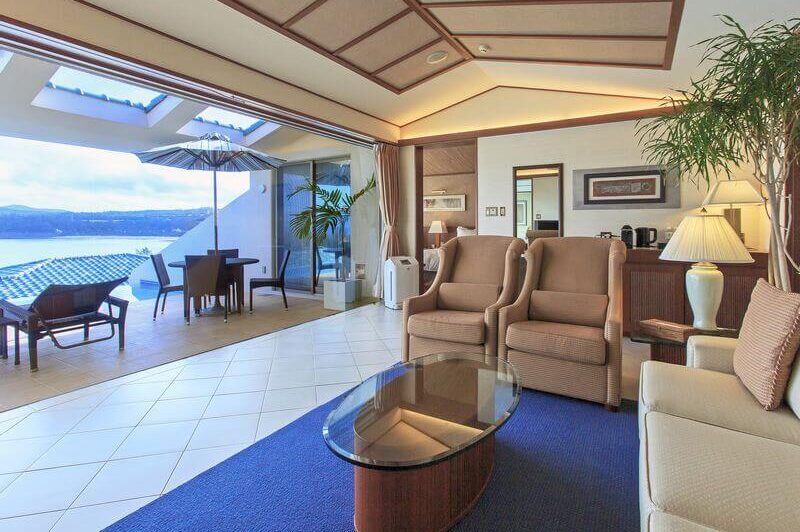 沖縄のリゾートホテルでは珍しい、まるで旅館のような佇まいが印象的なホテルです。館内は、和と琉球の様式が融合した高級感のある雰囲気。そしてどこか懐かしさも感じる、まさに “大人の隠れ家” と呼ぶに相応しいホテルです。「百名伽藍」は数々のホテル関連の賞を受賞しており、ゲストひとりひとりに合わせたホスピタリティの素晴らしさは折り紙付きです。夫婦でぜひ利用してほしいのが、最上階にある天空露天風呂。露天風呂の隣に畳の間を備えた全6室だけのプライベート空間で、誰にも邪魔されずに夫婦だけの時間が過ごせます。畳の間ではスパやエステを受けることもでき、存分にリラックスするための空間になっています。
