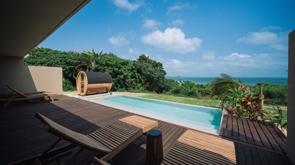 宮古島との間を結ぶ、伊良部大橋の袂に建つ「アヤンナ宮古島」。客室は全て南向きで、宮古ブルーが眺められるプライベートプールを配置しています。追加料金が必要ではありますが。温水機能を付けることもできるので、寒い冬の季節でもリゾート気分が堪能できます。朝食には、プライベートプールに提供される「フローティングブレックファスト」がおすすめ。大きなトレーに色とりどりのメニューが並び、一気にフォトジェニックな景色が広がります。他にもテラスで絶景を望みながらBBQが満喫できる客室や、潮風を浴びながらサウナを楽しめる客室など、個性的な3タイプの部屋を用意。全7室だけのプライベート時間を大切にできるホテルで、まったりとリラックスタイムを過ごしてみてはいかが。