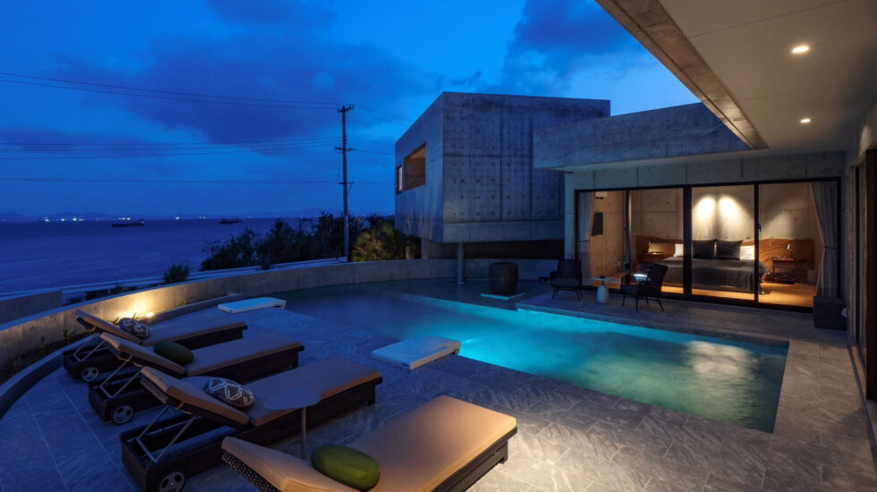 1日にたった3組だけのゲストを迎える「~Villa Rikyu~ 離宮」。建物1棟貸しで、自分たちだけの別荘のようにプライバシーを守りながらワンランク上のステイが叶えられるホテル。各ヴィラ専用の温水式プライベートプールを完備。オフシーズンとなる冬季も気にせず、宮古ブルーを望むリゾート気分が味わえます。プールサイドでBBQや朝食を楽しんだり、プールに足だけつけてドリンクを味わったり、人目を気にする必要がないから過ごし方は自由自在。自分たちだけのナイトプールを楽しみながら夜空に瞬く星空を眺めるのも、ロマンチックで素敵ですよ。