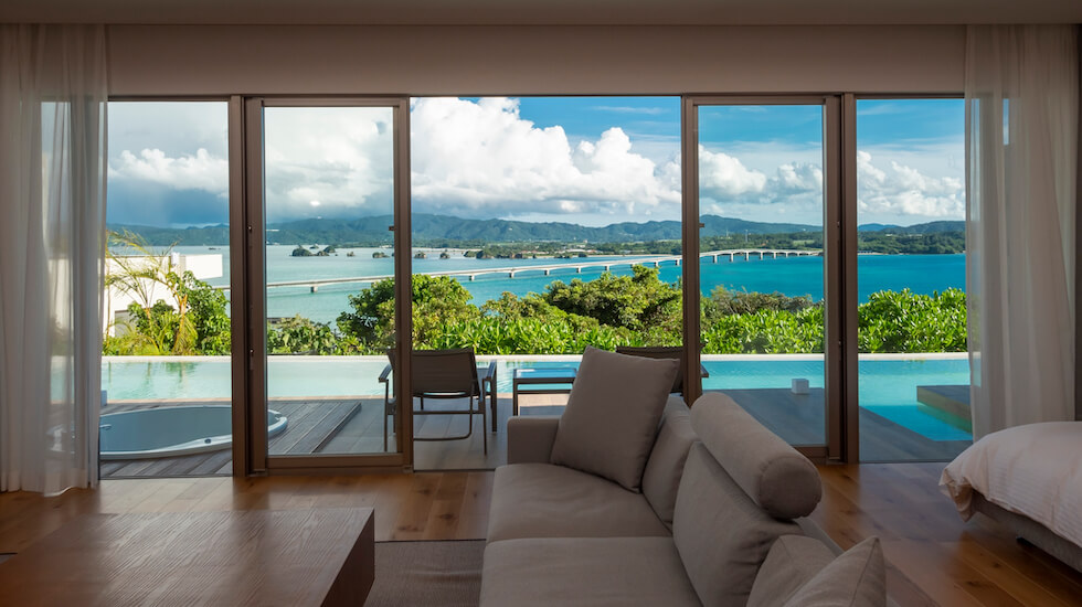 2024年4月にリニューアルオープンした、沖縄本島北部の橋で繋がる離島「古宇利島」にあるホテル「コルディオテラス古宇利島」。ホテルは「プールヴィラ古宇利島」と「プライベートコンド古宇利島」の2施設に分かれており、旅行シーンによって使い分ける事が可能。特に「プールヴィラ古宇利島」は、古宇利大橋と真っ青な海を臨む絶景を目の前に、インフィニティプールやジャグジーを楽しめる贅沢仕様です。全室100平米を超える広さを誇り、広々としたリビングスペースと、個室になったベッドルーム、畳間の和室スペースまで、大満足の広さ。「プライベートコンド古宇利島」には、個室のベッドルームが2室備わったメゾネットタイプの客室も。グループ旅行でもプライベートを確保しつつも、一緒の客室で楽しめるのでおすすめです。キッチンや大きめの冷蔵庫や電子レンジ、洗濯機や乾燥きまで完備されており、暮らすように快適に滞在することができます。