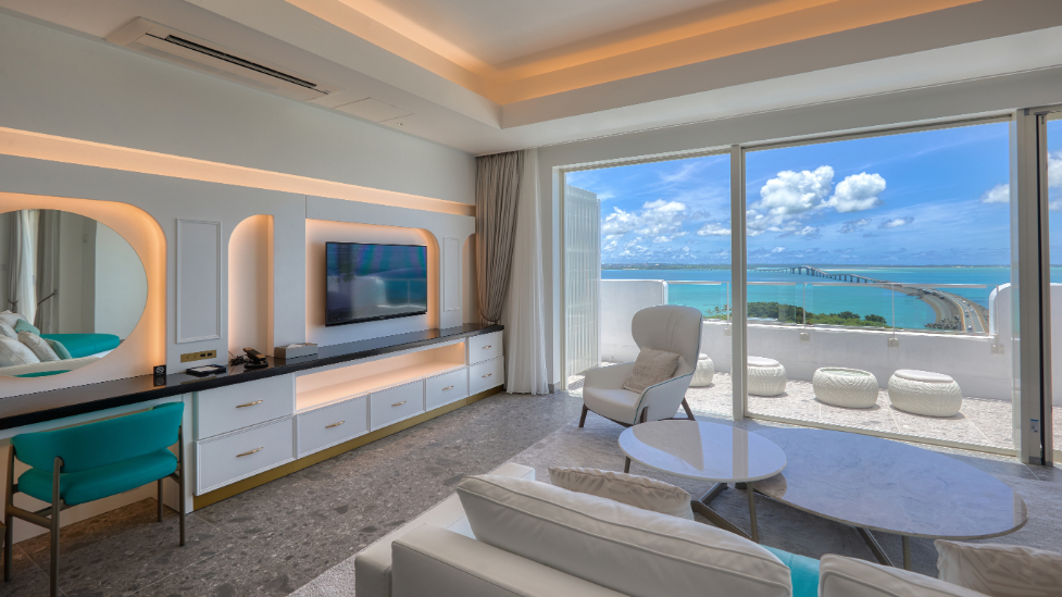 ギリシャ・サントリーニ島を再現した唯一無二のホテル「ブルーオーシャン ホテル&リゾート宮古島」。宮古ブルーや青い空に映える、白い外壁と青い屋根が特徴的なホテルです。客室内のインテリアも宮古島の海を想わせるブルーカラーで統一され、乙女心を擽る空間に。客室の中でも「ロイヤルスイートヴィラ」はプライベートプールとジャグジーが付いた贅沢なスイートヴィラ。ジャグジーは屋上階のルーフトップテラスに配置されているので、海や夕日、星空を眺めながらジャグジーに浸かる、なんて優雅な過ごし方も叶います。