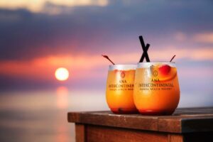 恩納村の豊かな海に囲まれたリゾートホテル「ANAインターコンチネンタル万座ビーチリゾート」。恩納村を代表するビーチ「万座ビーチ」や、知る人ぞ知る小さなプライベートビーチに屋外プールなど、心ゆくまで南国リゾートらしい過ごし方のできるホテルです。館内には多種多様の料理が楽しめる、9つのレストランやバー、カフェなどが揃います。恩納村の海を彷彿とさせる、モダンな雰囲気漂うバー「ウェイビー」は、受賞歴のあるカクテルや泡盛、ウイスキーにワインなど、豊富なアルコールメニューが魅力です。ホテルから美しいサンセットを眺めるには絶好のスポットなので、ディナー前の食前酒を楽しむのもいいかも。バーは24時まで営業しているため、夜遅くまで至福のひと時が過ごせるのはうれしいですね。