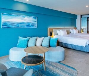 全室スイートルームかつオーシャンビューの宿「カフー リゾート フチャク コンド・ホテル」。客室はホテル棟、コンドミニアム棟とセレクト家具や家電が揃ったアネックス棟の3タイプから選べます。インフィニティプールが館内の2ヶ所にあり、恩納村の海と溶け合うような光景を眺められますよ。このホテルのランチは、「Wine & Dining The Orange」でオーダービュッフェ形式の琉球イタリアンが楽しめます。また、テイクアウト専門の「Deli & Café」では、沖縄そば・ゴーヤチャンプルーなどの沖縄料理のほか、バーガーやフライドチキンといったアメリカンなメニューも充実していますよ。