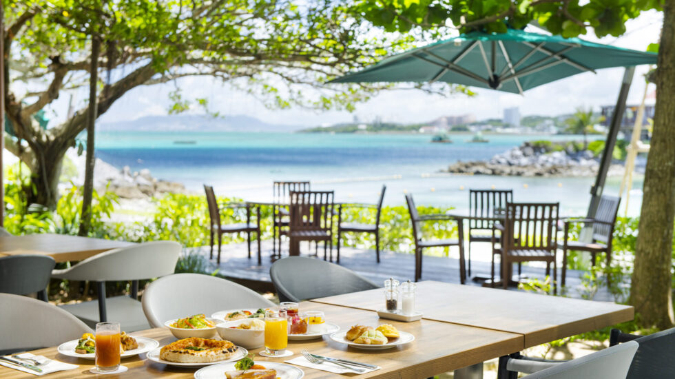 透明度の高い海で楽しむマリンアクティビティの他にも、「星空浴と宙さんぽ」や「Morning Yoga」など豊富なアクティビティメニューが揃います。ぜひ体験してほしいのが沖縄初の海上ジップライン「メガジップ」。時速30キロで250メートルほどのロープを滑走するスリルと、目の前に広がる景色を楽しんでください。ビーチに立つ海上桟橋からは、沖縄ブルーの海や夕日、星空が楽しめる絶景スポットとなっています。朝食は海の見えるレストランで、シェラトンクオリティの絶品朝食に舌鼓を打って。焼きたてパンやオムレツの他、沖縄料理やトロピカルフルーツなどが並び、リゾートらしい朝食時間を過ごせます。