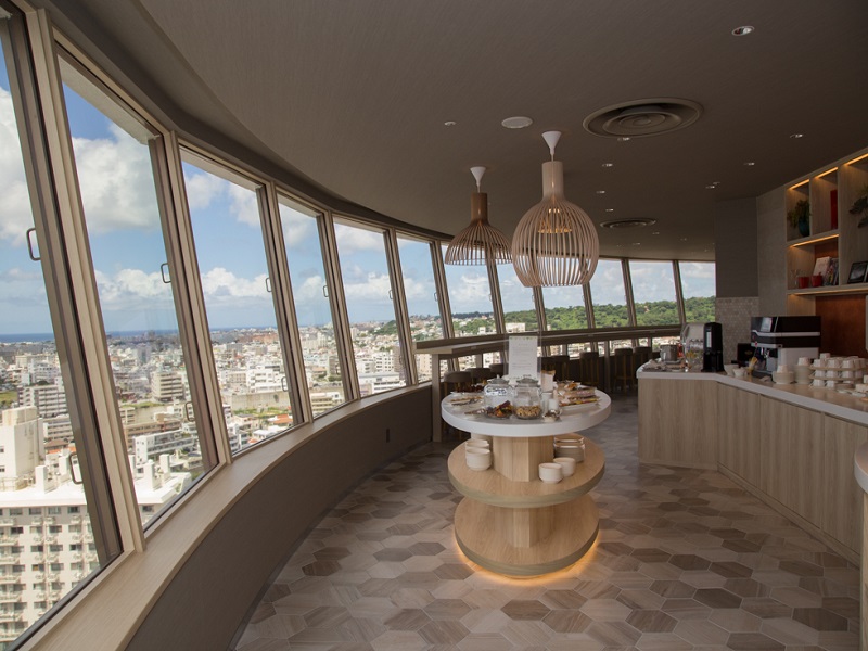 「プレミアラウンジ(クラブラウンジ)」はプレミアフロア、テラススイート、テラスルームに宿泊するゲストのみが滞在中に利用できる特別な空間。ホテルの最上階(15階)にあり、那覇市街をぐるりと見渡せるのはもちろん、晴天時には遠くに慶良間諸島を望める360度のパノラマビューが自慢です。刻一刻と表情を変えゆく景色を、ただぼーっと眺めているだけでも、この上ない幸福感に満たされることでしょう。
