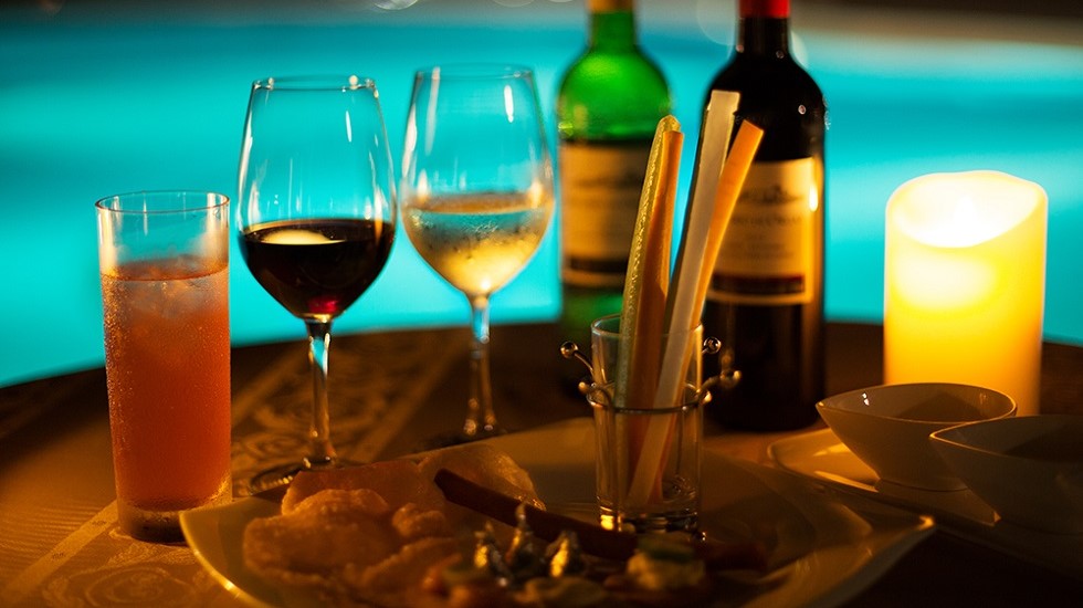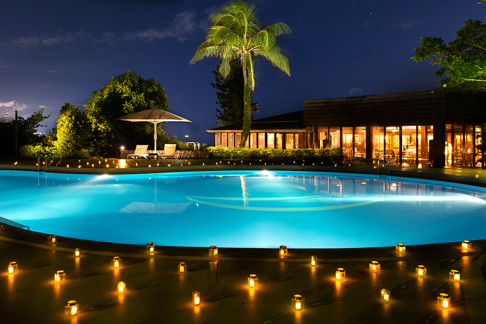 キャンドルの光に包まれた幻想的なプール、ナイトカクテルで乾杯! | ココ ガーデンリゾート オキナワ
