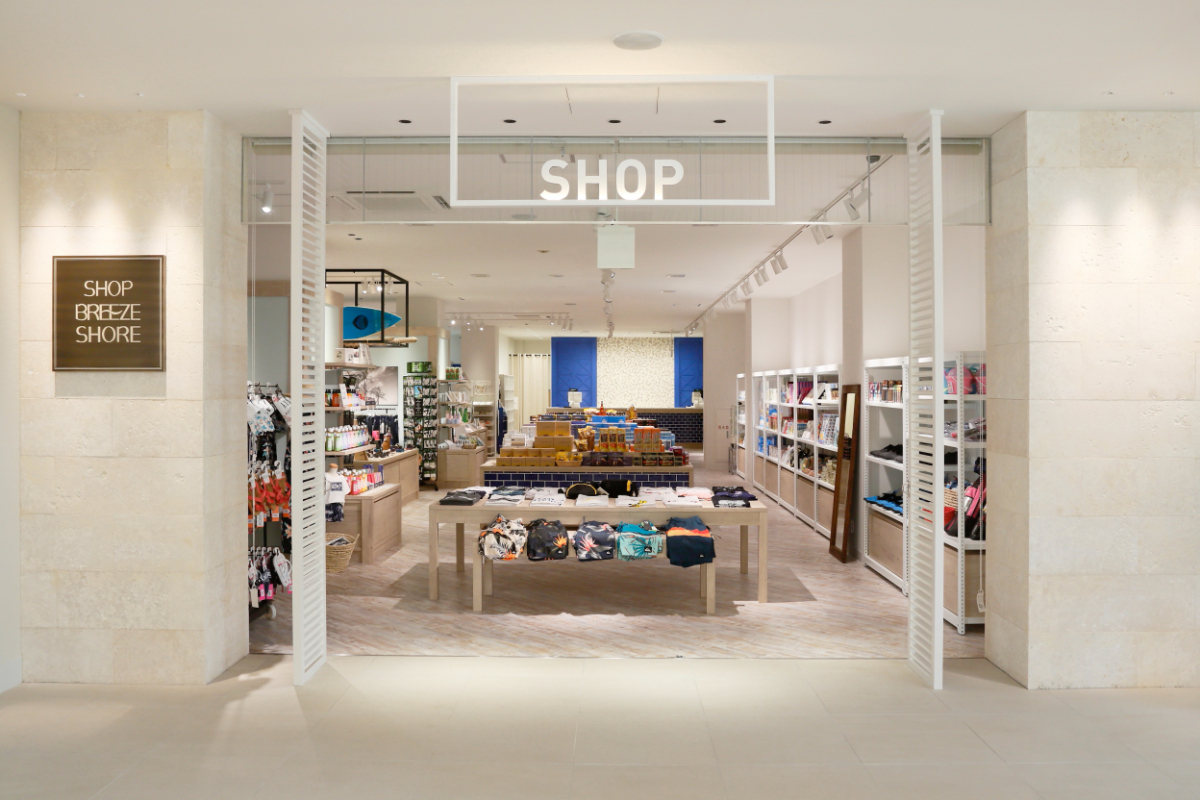 本館ロビーフロアにあるショップ「ブリーズショア」。店内にはマリンアイテムやリゾートファッション、宮古島ならではの土産品までを幅広く展開。さらに、ホテルステイを充実させてくれる日用品なども豊富に取りそろえています。