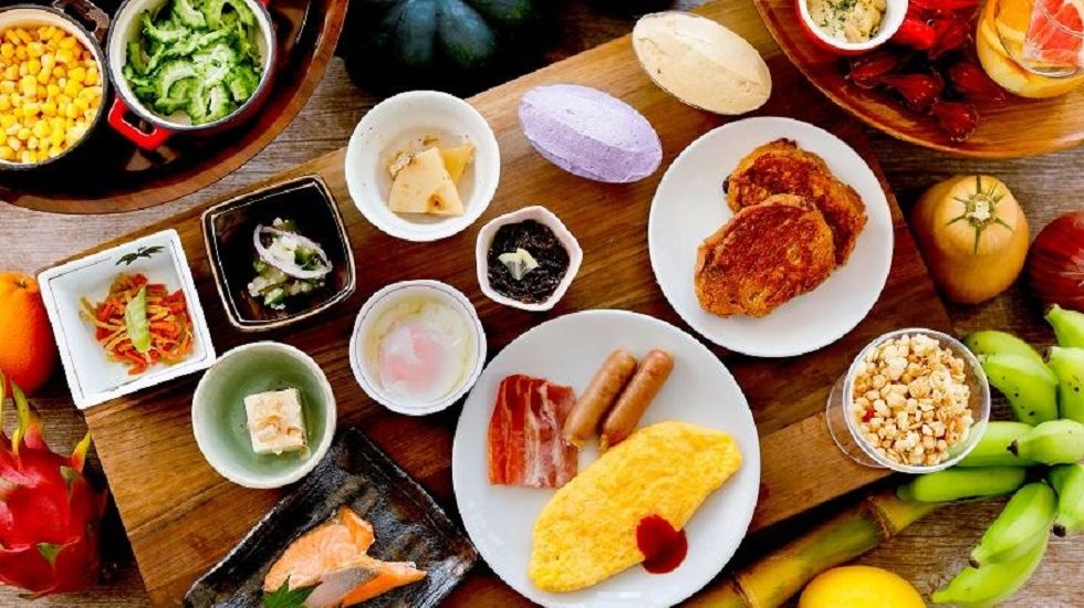 朝食は宮古島で採れた新鮮な食材をふんだんに取り入れ、郷土料理から定番の和洋食まで常時約40種類のメニューが並びます。