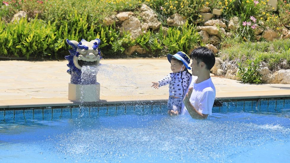 夏はやっぱりプールが大人気!沖縄の守り神「シーサー」の口から噴水が出る楽しい仕掛けも。