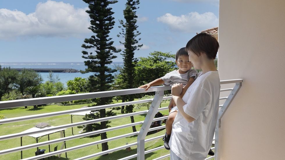 認定された本館「デラックスルーム」は、白が基調の広々とした角部屋で、海を望むテラス付き。ベッドガードやコーナーガードの設置、小さな子どもでも安心して遊べるマットコーナーなど、安全対策が施されています。子ども用体温計、ベビーベッド、ベビーカー、ベビーバス、レゴブロックなど無料のレンタルアイテムも充実!