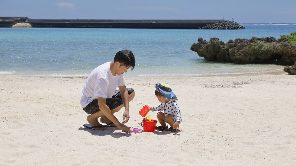 宮古ブルーの海を背景に砂遊び。ママ・パパは可愛い子どもの写真撮影で大忙しの予感。