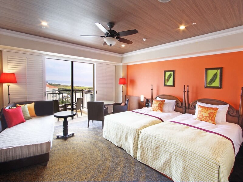 南国の眩しい太陽をイメージした客室「プレミアオーシャンパティオツイン」の全景です。