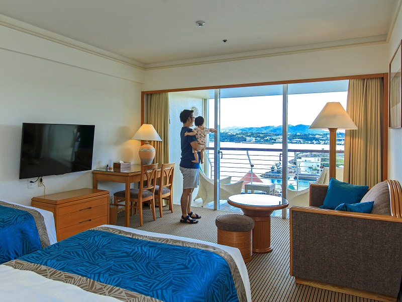 客室での一枚。バルコニーの先に広がる青い海と空の絶景を目にしたときは、子どもながらにリゾートステイのワクワクを感じました。家族と特別な時間を過ごす非日常感は、今も忘れられません。