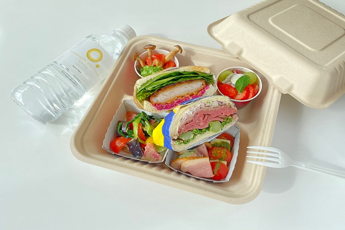 ホテルメイドのパンがは絶対に味わってほしいメニューのひとつ。創業当時から、ずっと変わらず自社で製造している人気のパンです。他にも、県内のホテルレストランでは珍しく、5種類の沖縄そばが食べられるのでこちらもお見逃しなく。客室でゆっくりと朝食を食べたい方には、サンドイッチや前菜、果物などが入ったテイクアウトボックスに変更できますよ。