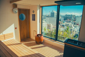 露天風呂の横のスペースには、チェアとサンベッドが用意されており、誰でも自由に利用が可能。浴場にはサウナも設置されているので、サウナーならここで外気欲を堪能できますよ。“ととのう” 準備万端です♪