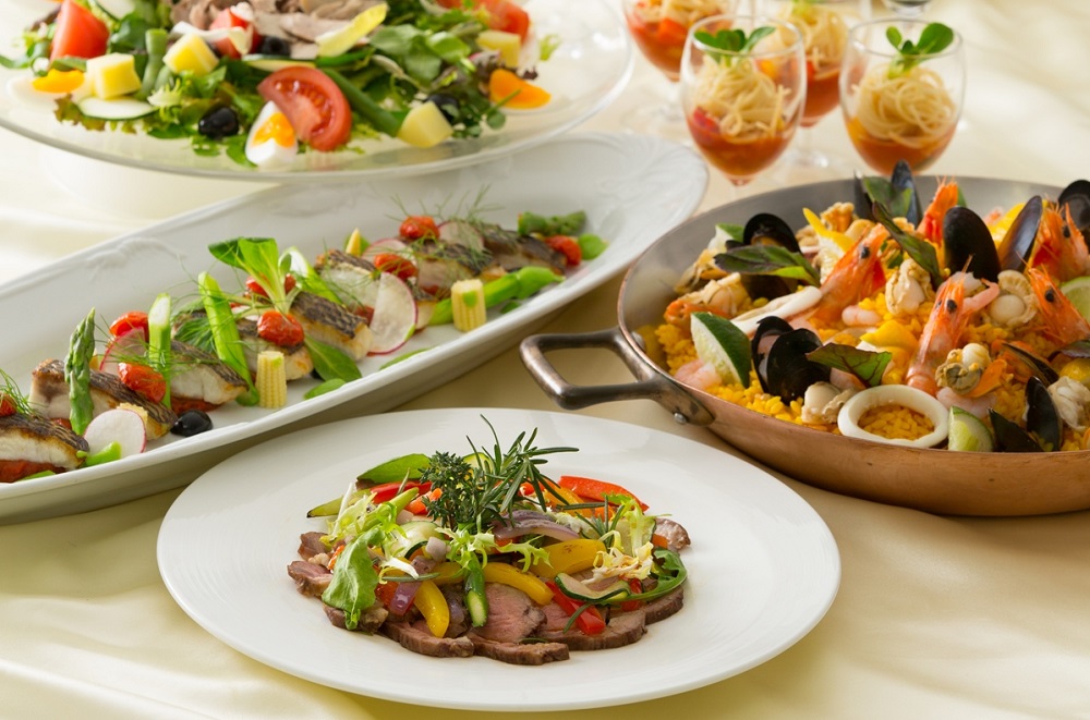 日替わりの肉料理や魚料理、シェフの特性オードブル、パスタや人気の自家製パンなど。彩りも豊かな料理やドリンクが約50種類も並んでいます。オープンキッチンでは、焼き立てのステーキをご用意。スイーツやアイスクリームの種類も豊富です。