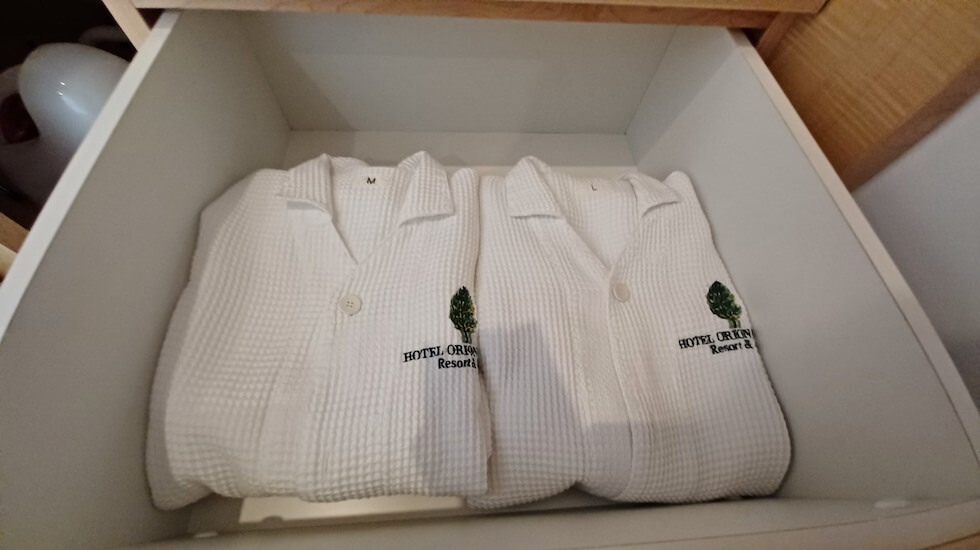 お部屋には、オリオンホテル モトブ リゾート&スパのロゴが入った室内着が用意されています。上下セパレートタイプで、寝ている時も捲れたりしないので安心。ふわふわのワッフル生地で肌ざわりよく、快適な睡眠に誘ってくれそうです。