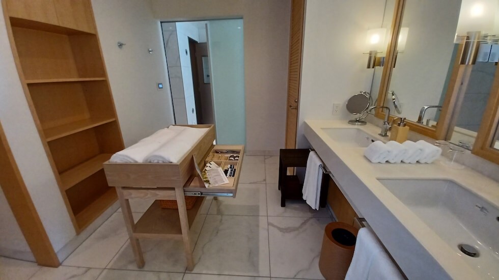 洗面台も豪華仕様。なんとロイヤルスイートの客室には特別に、サウナがあります。館内の温泉大浴場を満喫しつつ、戻ってきてからお部屋のサウナで疲れを癒すことも可能ですよ。