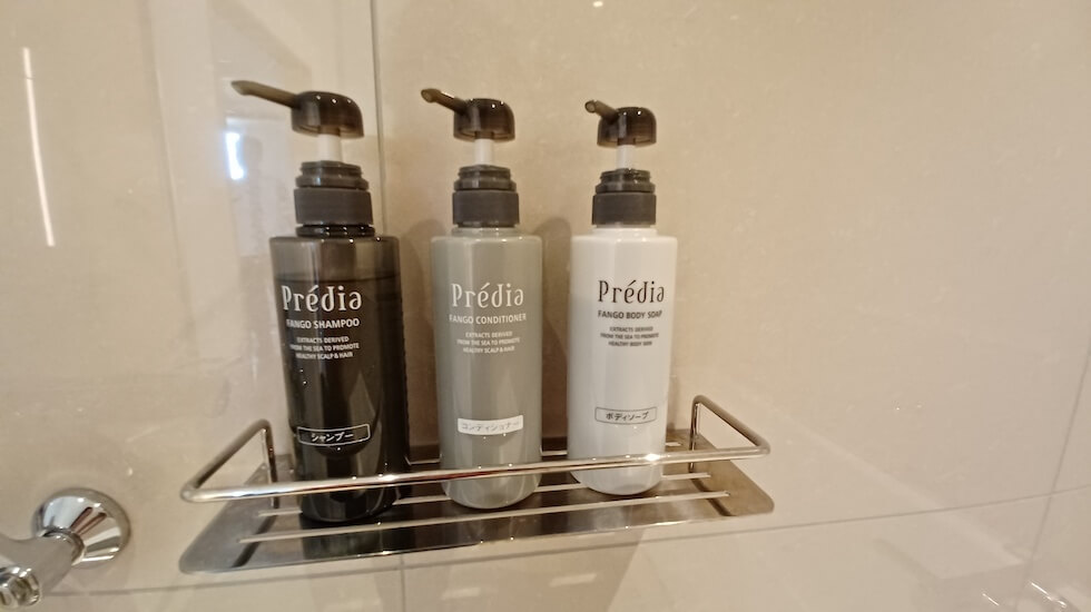 バスアメニティは、海洋深層水や天然ミネラル泥などを配合した「Predia(プレディア)」シリーズ。海の恵みを感じられる、シャンプー・コンディショナー・ボディソープで癒しの時間を。