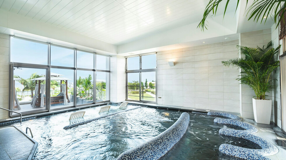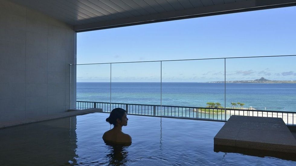 約2億年以上前のジュラ紀の地層から湧き出る天然温泉に入れるジュラ紀温泉「美ら海の湯」。肩までつかってゆっくーりと温まり、日頃の疲れを癒しましょう♪半露天風呂では沖縄の風にあたりながら、絶景を楽しんで。内風呂に入りながらでもオシャンビューが眺められるので寒い時期でも問題なし◎ おすすめの時間帯はサンセットタイム。天気が良ければ夕日で赤く染まる海と伊江島を一望することができるんです!