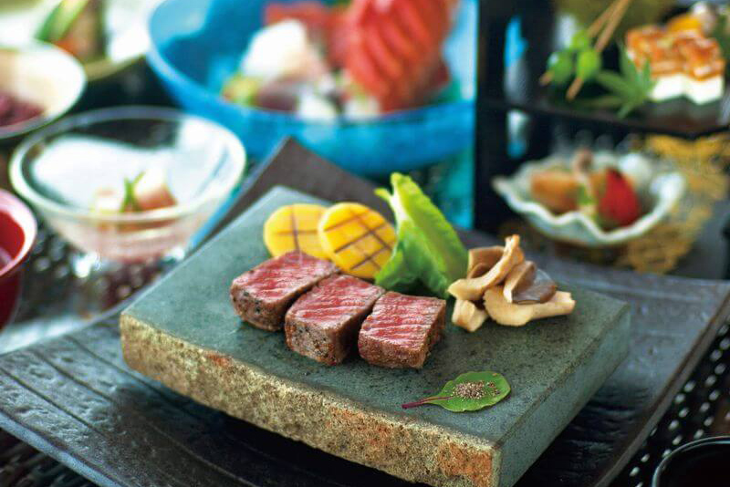 夕食は、館内のレストランで和琉の会席コースを。全部で9品ほどが並び、季節によってその内容は変わります。ただし連泊やリピーターのゲストが飽きないよう、ゲストに応じて都度メニューは変更。何度泊まっても新しい味に出合えることも、常連客の楽しみの一つのようです。