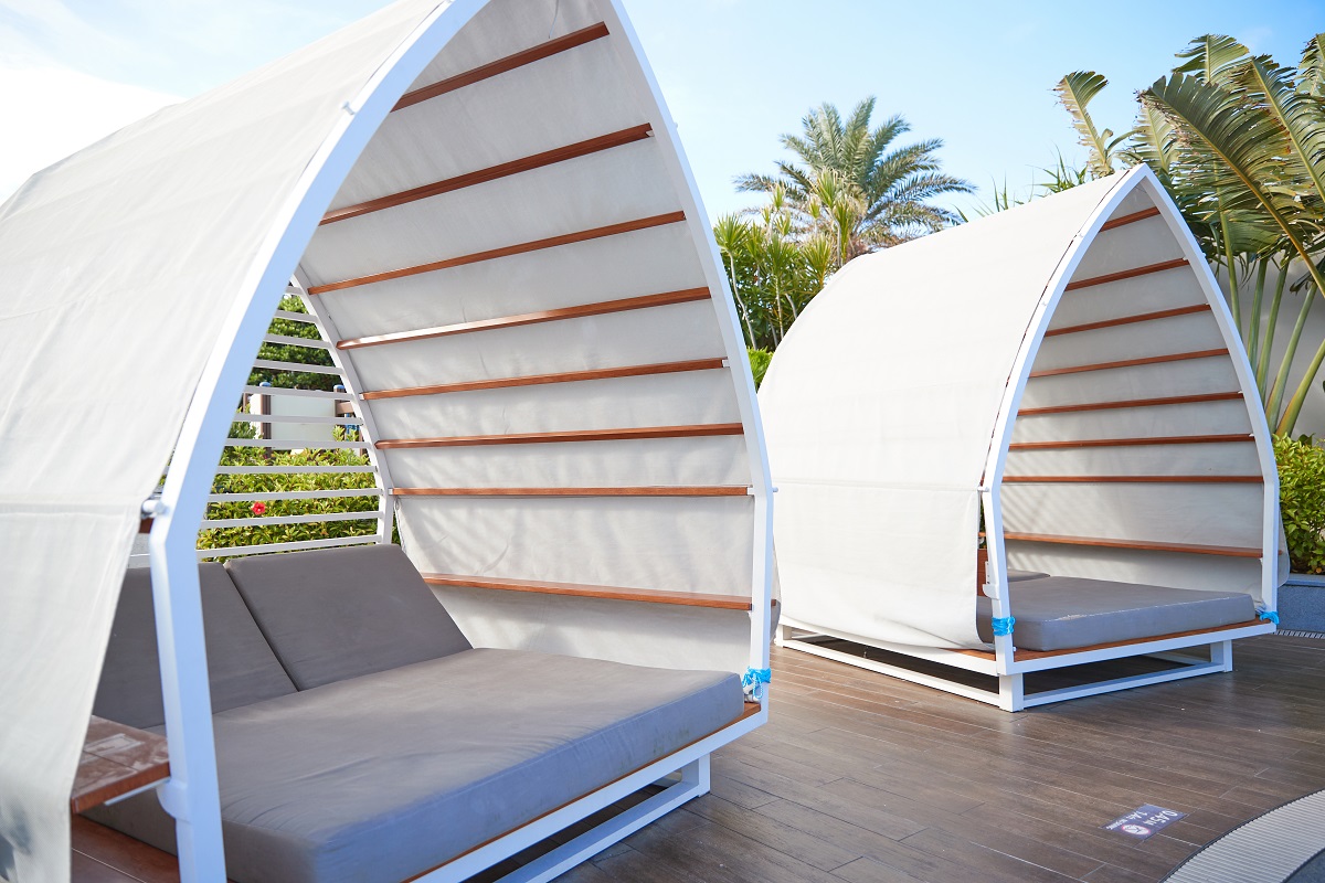 ちょっとしたプライベートスペースとして、優雅なひとときを過ごせる屋根付きカバナ。無料で利用できるのが嬉しいですね。