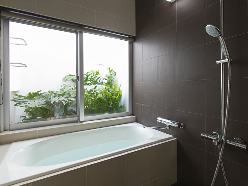 箱庭の緑を眺めながら入浴できるバスルーム。広めのバスタブと肌に優しいレインシャワーが旅の疲れを癒やしてくれます。