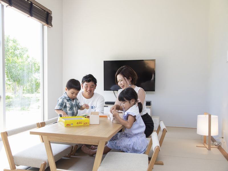 外遊びに疲れたらリビングでゲームに挑戦。まるでわが家のようにくつろいで、大人もついつい夢中になります。