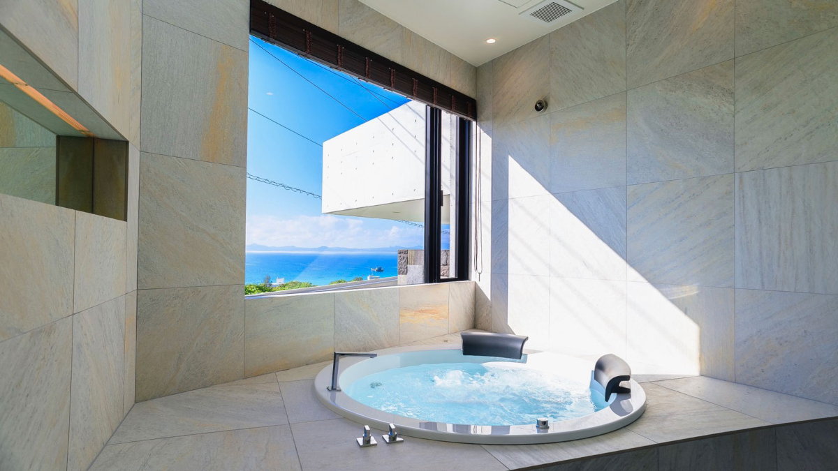 バスルームにはジェットバスを完備。ビューバスになっているので、晴れていれば瀬底島の海を眺めながら癒しのひと時が過ごせます。