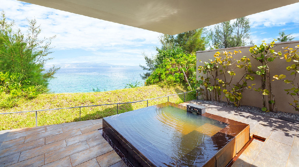 ホテル敷地内には源泉があり、5棟のヴィラの宿泊者は天然温泉で湯浴みを満喫できます。クリフ ヴィラとハレクラニ クリフ ヴィラにはプライベートプールも備わっていて、遊泳して疲れた体をすぐに温泉で温めることも◎ ヴィラの露天風呂で、沖縄の海や大自然を眺めつつリラックス。