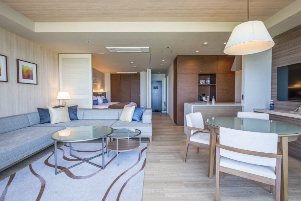 恩納村の高台に位置する「HIYORIオーシャンリゾート沖縄」。全室オーシャンビュー&フラットテラス付きという贅沢な空間です。70平米以上の広々としたリビングは、まるで客室が海と空に溶け込むような開放感。夕食は2つのレストランやインルームダイニングで多彩に堪能でき、インフィニティプールや露天大浴場、サウナなど館内施設も充実。ラグジュアリーと利便性が両立した、自由なリゾート時間を楽しめるホテルです。