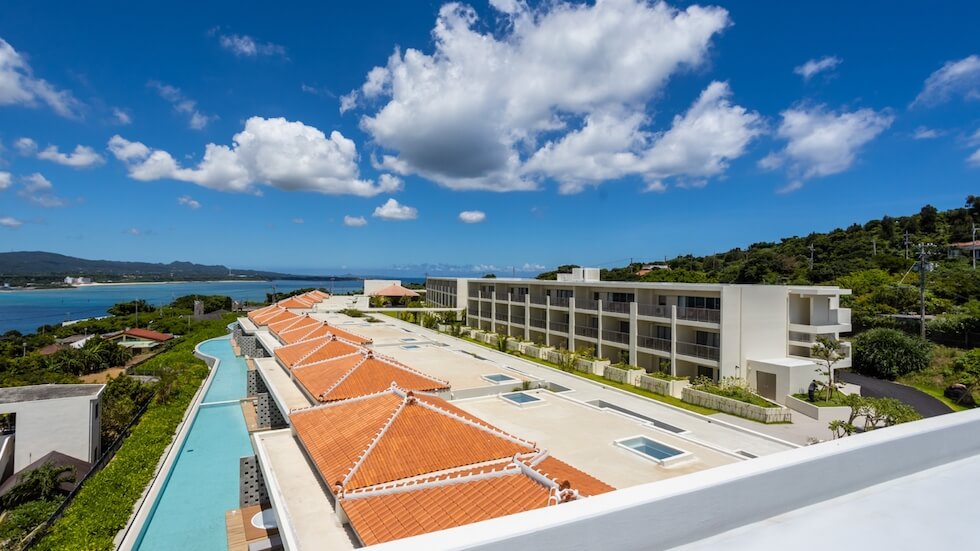 2024年4月開業のリゾートホテル「コルディオテラス古宇利島」。古宇利島の高台に立ち、離島らしい穏やかな雰囲気と豊かな自然に包まれた環境にあります。