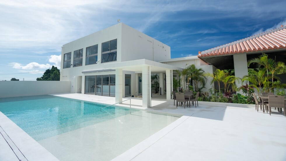 プライベートコンド 古宇利島のゲストが使用できるアウトドアプール。穏やかな空気に包まれた環境で、心地よい風を感じながらリゾートを満喫。小さな子連れでも、水辺でちゃぷちゃぷ遊ばせられます。