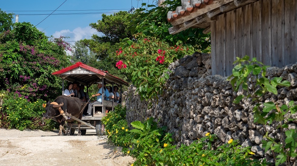 離島巡り初心者さんにおすすめなのが、移動時間が短い竹富島。沖縄の原風景が残る竹富島へは高速船で約10~15分ほど。のんびり進む水牛車に揺られながら、赤瓦屋根や石垣が連なる集落を散策する、ゆったりとした島時間を楽しめますよ。