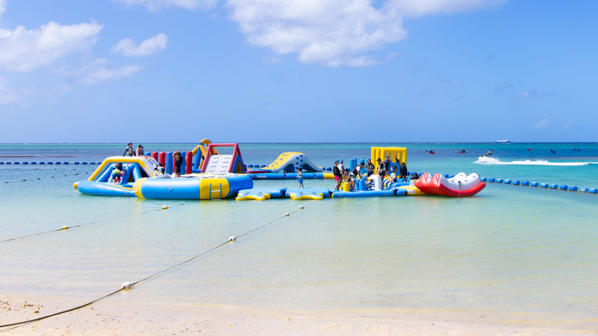 グランドメルキュール沖縄残波岬リゾートでは、残波ビーチのアスレチックやアクティビティも一部、プランに含まれています。なんと、夏の期間オープンしている「ざんぱウォーターアスレチック」でも遊べちゃいます。他にもパラソルやデッキのレンタルも可能です。