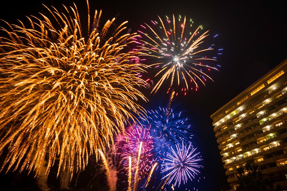 残波岬の夜空を彩る大輪の打ち上げ花火を堪能する特等席は、プールサイド!週末はナイトプールも開催されているので、おすすめです。