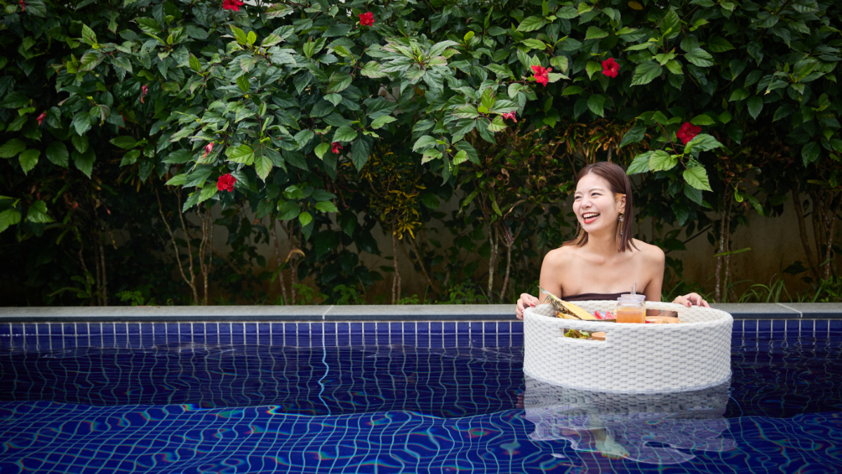 まるでビュッフェで取ってきたような種類豊富さは、少しずつたくさん食べたい方にぴったり。プールに浮かびながらフルーツやサラダをつまむひとときは、南国気分も盛り上がります。