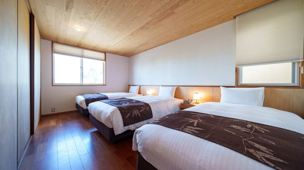 「【 別邸 】結の家Ⅱ」の客室には、和室を含めてベッドルームが3つ。和室には敷布団が6組用意されており、小さな子どもも安心して眠れますよ。ベッドは、セミダブルベッドが合計5台用意されています。