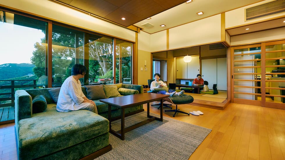 上質な和の空間に洋のテイストが光る、おしゃれな平屋の一棟貸しリゾート「GLAMPETIT KOH」。木々に囲まれた自然の温もりを感じられる立地です。2方向に大きな窓を備えた明るいリビングには大きなソファがあり、すぐ隣には和室も。外にはテラスデッキがあり、沖合いに浮かぶ初島や正面に据える絶景を心ゆくまで堪能できます。セミダブルベッドを2台入れた寝室もあり、最大6名まで宿泊可能。夕食は、BBQ・金目鯛のしゃぶしゃぶ・手巻き寿司3種のメイン料理と、15種類以上の副菜から選べます。朝はぜひテラスに出て、みんなで優雅な朝食タイムを過ごして。