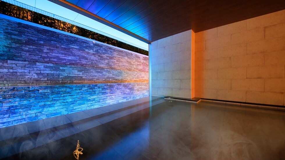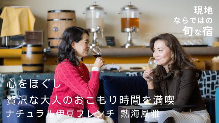 熱海駅から車で10分ほどの高台にある「ナチュラル伊豆フレンチ 熱海風雅」。新館の3階・4階からは熱海の海と街並みが一望でき、滞在を贅沢なものにしてくれます。広い屋上テラスには個室のブースがあり事前予約して利用するスタイル。絶景をゆっくりと独り占めできます。チェックイン・チェックアウト、食事時間の予約やドリンクオーダー、帰りの専用車での見送り予約まで、モバイル端末や自分のスマホから操作が可能。フロントが混雑することはほとんどなく、快適さを実現しています。ゲストに人気なのは、15時~17時にロビーで振舞われるウェルカムドリンク&フード。スパークリングワインや季節のドリンク、コーヒーに加え、チョコや焼き菓子が自由に楽しめます。こだわりのBoConceptのソファに身をゆだね、快適なひと時を過ごしましょう。女性専用岩盤浴や男性専用ドライサウナがあって、おこもり時間を格上げ。滝から流れる水音が心地よい温泉の大浴場も自慢です。