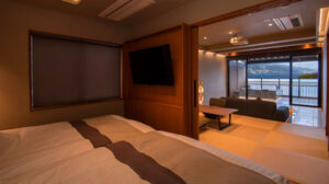 少し山を登った場所にある熱海の宿「時間を旅する宿 海のはな」。辺りに遮るものは何もなく、熱海と網代湾の景色を一望できるロケーションが魅力のホテルです。全7室の客室全てに露天風呂を完備しているので、大切な人とのおこもりステイにも最適。サウナ好きの方は、2023年2月にリニューアルした客室「海の間」がおすすめです。贅沢にもプライベートサウナが設置されています。石張りの露天風呂には水中ライトが付いていて、夜に入れば昼間とは違った幻想的な雰囲気が漂いますよ。サウナやお風呂の前後に楽しみたいのが、飛騨牛や新鮮な魚介をふんだんに使ったおいしい食事。夕食には、ホテル料理長による創作懐石料理を静岡の地酒と一緒に堪能し、熱海の魅力を五感で楽しみましょう。