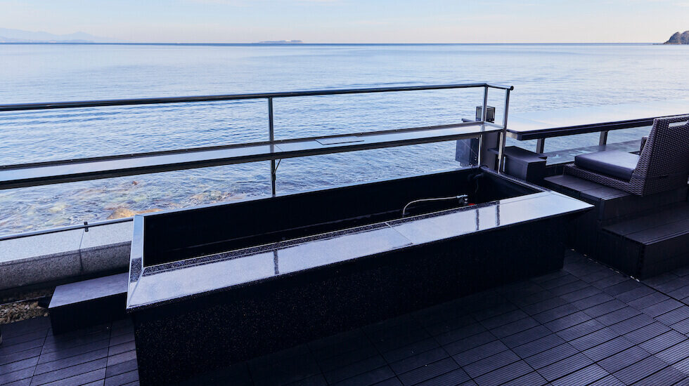 伊豆高原や伊豆シャボテン動物公園など、人気の観光スポットが付近に点在する「ラグジュアリー 和 ホテル 風の薫UMI」。手を伸ばせば届きそうなほど、伊豆の海を近くに感じられるこちらのホテルでは、オールインクルーシブを採用しています。ホテル内には、無料で気軽に楽しめる施設やサービスが充実。海が見渡せる足湯バーやエステフィッシュを受けながらスパークリングワインを楽しむ、そんなおしゃれで格別なひと時を過ごすのもいいかも。撮影用の台が用意されたスポットもあり、友人や恋人とおしゃれでフォトジェニックな写真を撮ってくださいね。よりラグジュアリーなステイを希望する方は、8階の特別フロアの客室がおすすめ。黒い琉球畳が高級感を演出する部屋や女優ミラーのある部屋など、とことんおしゃれに過ごせる工夫が施されています。