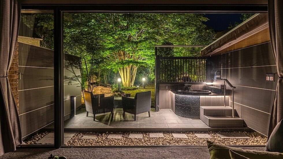 「かえで庵」は、英国コッツウォルズ地方の貴族旧邸をモチーフにした英国調アンティークホテルです。全8室の客室には専用露天風呂が付いており、自然のマイナスイオンを感じながら24時間自由に入浴可能。客室は英国アンティーク家具で統一され、古き良きイギリスの温かく落ち着いた雰囲気が漂い、まるで海外のリゾートにいるような特別な空間を提供しています。建物外観も英国風洋館そのもので、非日常感あふれるリゾートステイが叶います。アクセスも良く、カップルや記念日の滞在におすすめの大人の隠れ家的ホテルとして人気です。